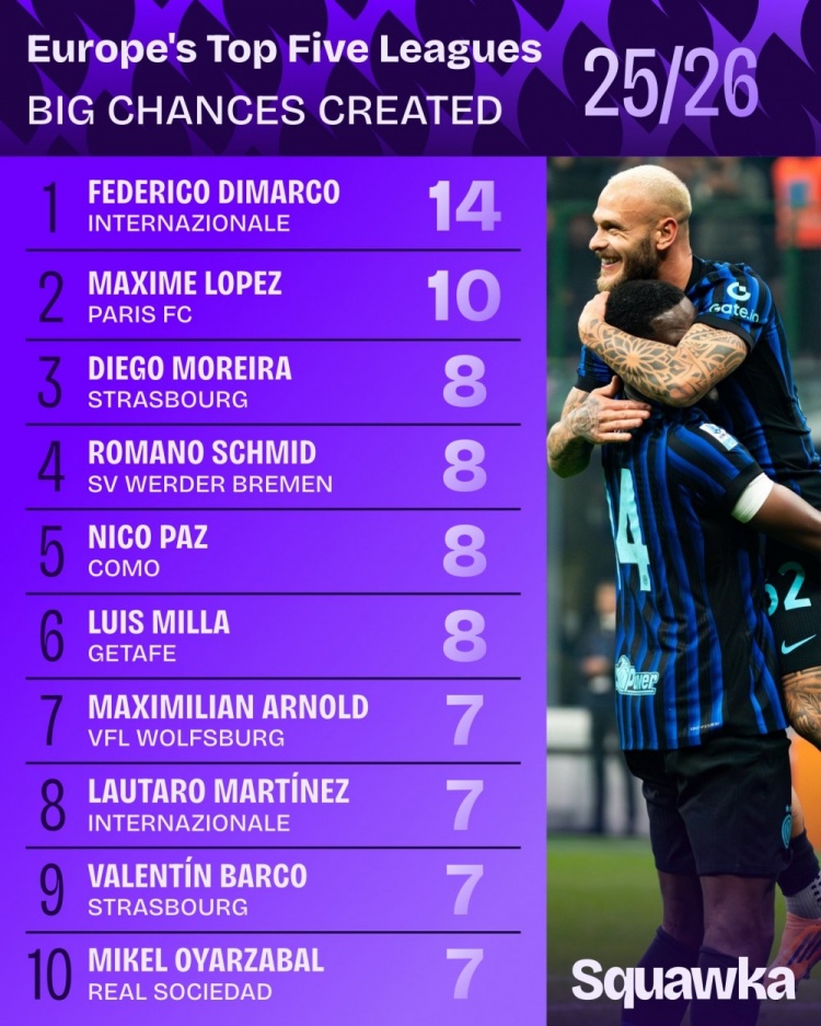 11月21日讯 Squawka统计了本赛季球员在五大联赛创造紧要契机的次数,比肩出榜单,迪马尔科创造14次紧要契机最多。 本赛季五大联赛创造紧要契机排行: 迪马尔科(海外米兰)——14 马克西姆·洛佩斯(巴黎FC)——10 迭戈·莫雷拉(斯特拉斯堡)——8 罗马诺·施密德(不莱梅)——8 尼科·帕斯(科莫)——8 路易斯·米拉(赫塔费)——8 马克西利安·阿诺德(沃尔夫斯堡)——7 劳塔罗(海外米兰)——7 瓦伦丁·巴尔科(斯特拉斯堡)——7 奥亚萨瓦尔(皇家社会)——7 |