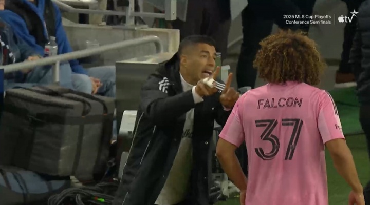 11月24日讯 好意思职联1/4决赛,迈阿密客战辛辛那提。 比赛第24分钟,转播镜头给到场下当天替补的苏亚雷斯,他叫来本队的首发中卫法尔肯,似乎是在向后者濒临面传授教训。 现在迈阿密凭借梅西早些手艺的头球破门1-0擢升。