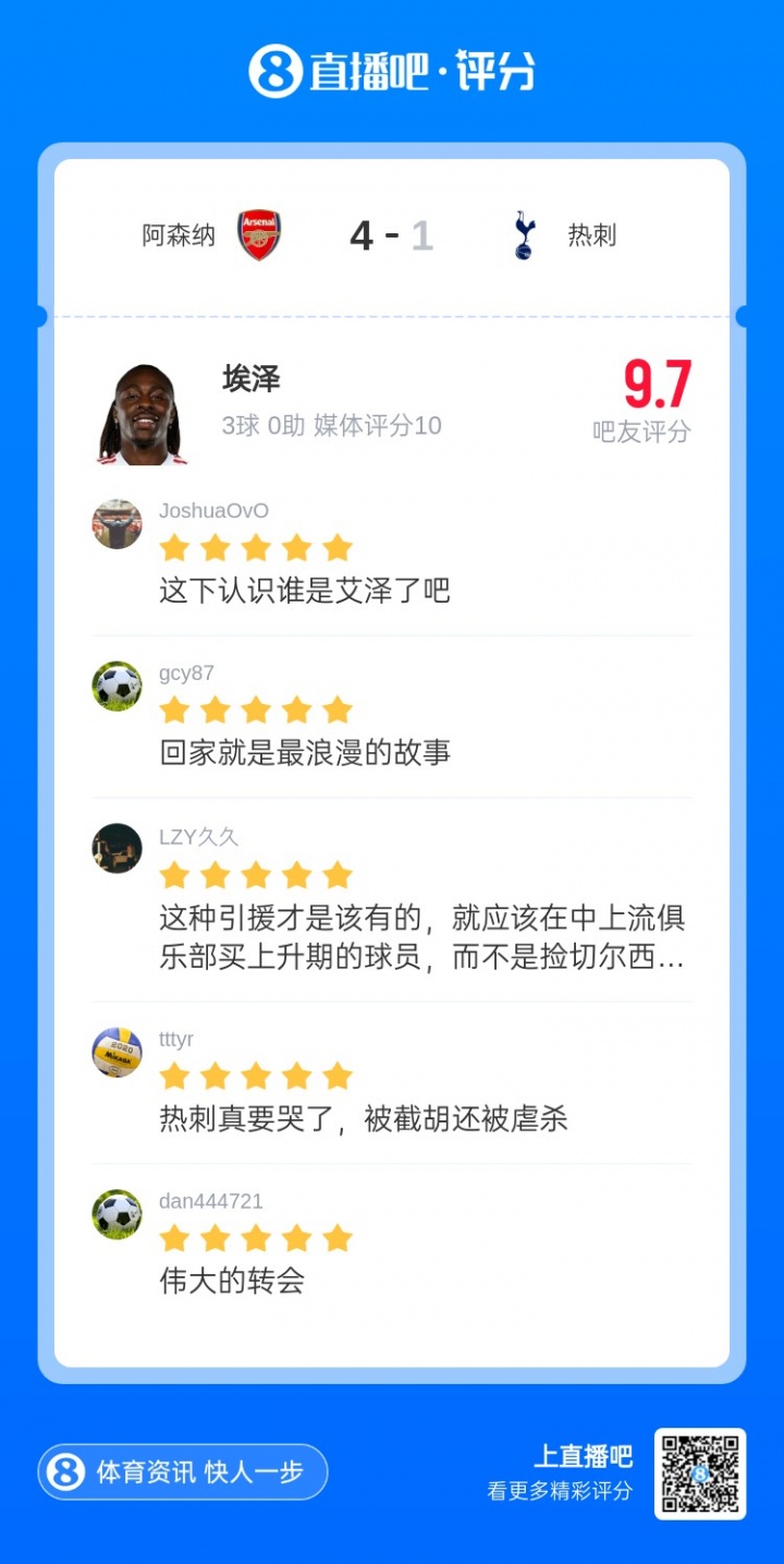 2025-2026赛季英超火热进行中,和咪咕体育伙同发起每轮英超最好球员评比行径!第12轮评比效果照旧出炉,埃泽当选! 在阿森纳4-1征服热刺的比赛中,埃泽帽子戏法带队取胜,演出了他在加盟枪手后的最好一战。埃泽取得吧友6.8万的投票,当选【X咪咕体育英超第12轮最好球员】! X咪咕体育|英超第12轮MVP评比 吧友热评: 这下意志谁是埃泽了吧; 回家即是最浪漫的故事。