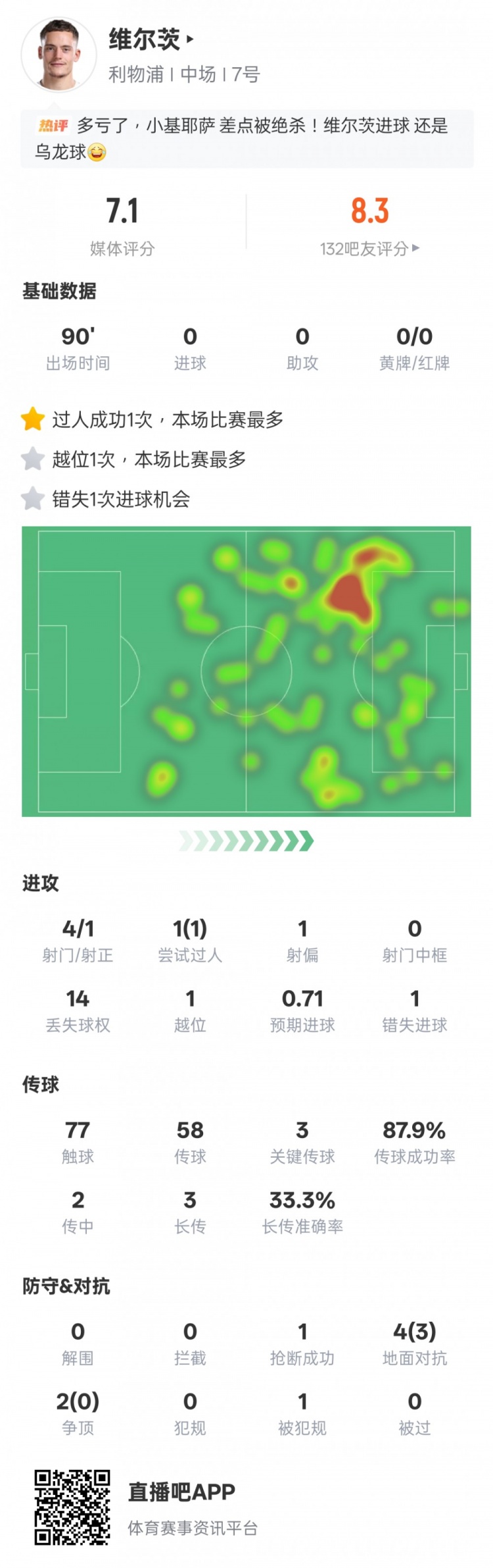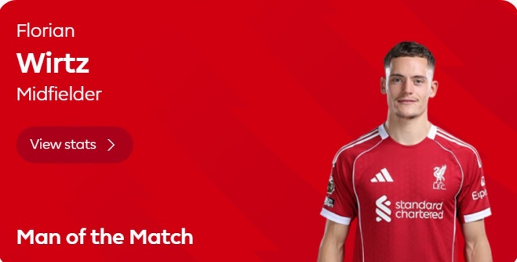 12月4日讯 英超第14轮比赛,利物浦主场1-1战平桑德兰。 此役维尔茨踢满全场,并造穆基勒乌龙,为利物浦扳平比分,英超官方晓谕,历程球迷的投票,维尔茨当选本场比赛最好球员。