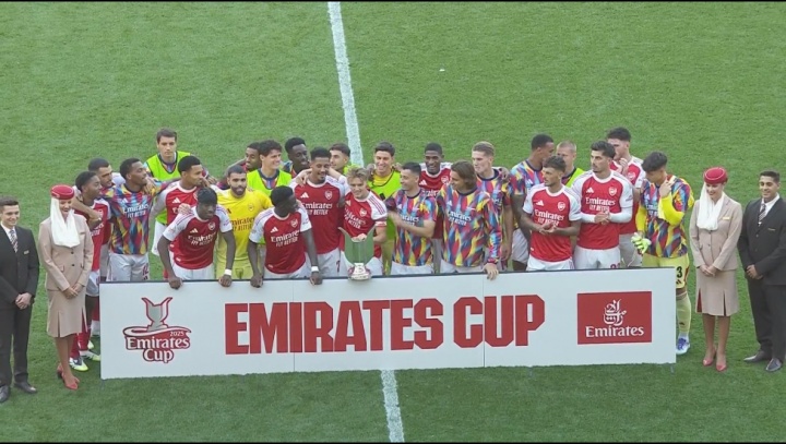 08月10日讯 酋长杯对阵,阿森纳3-0完胜毕巴。赛后现场举行了庆祝庆典。 阿森纳队长厄德高,代表球队手捧着冠军奖杯。 |