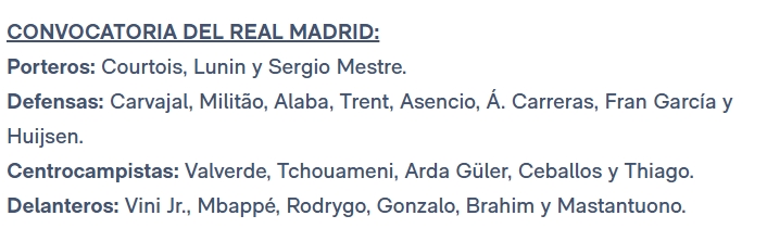 08月18日讯 皇马公布西甲首轮大名单! 门将:库尔图瓦、卢宁、梅斯特雷 后卫:卡瓦哈尔、米利唐、阿拉巴、阿诺德、阿森西奥、A费、弗兰-加西亚、怀森 中场:巴尔韦德、琼阿梅尼、居勒尔、塞巴略斯、蒂亚戈 时尚:维尼修斯、姆巴佩、罗德里戈、贡萨洛-加西亚、迪亚斯、马斯坦托诺