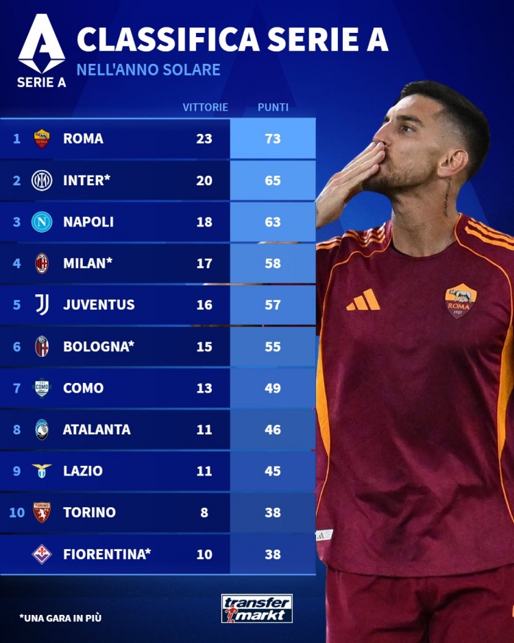 11月10日讯 德国转会市集统计了本年意甲球队拿到的积分,列出2025年意甲积分榜单,罗马73分居首。 2025年意甲积分榜: 罗马——73 国米——65 那不勒斯——63 米兰——58 尤文——57 博洛尼亚——55 科莫——49 亚特兰大——46 拉皆奥——45 都灵——38 佛罗伦萨——38 |