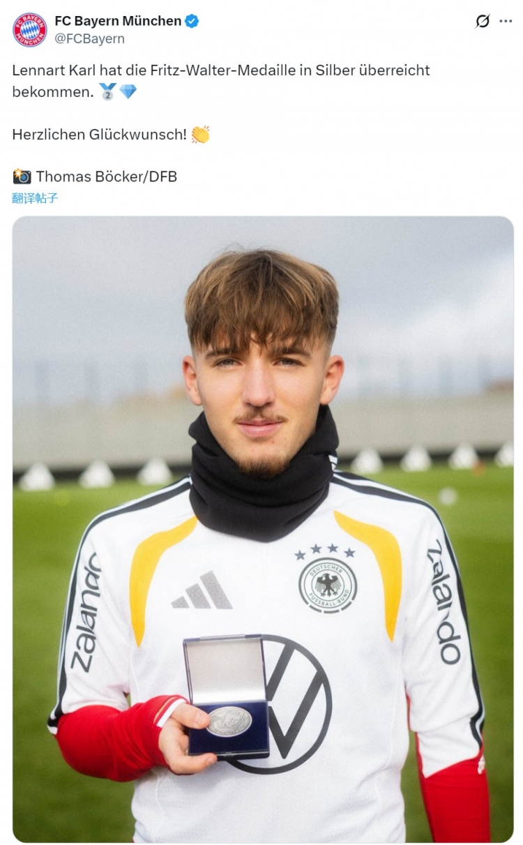 11月13日讯 据官方音问,拜仁中场伦纳特·卡尔获取弗里茨·瓦尔特银质奖章。 卡尔获取德国足协颁发的弗里茨·瓦尔特银质奖章,拜仁官方社媒晒出这位小将展示奖章的像片,对他示意道喜。 弗里茨·瓦尔特奖由德国足协确立,旨在赏赐德国年度最好后生球员,分为金银铜三个品级,对应各年齿组弘扬最为出色的前三名新星。