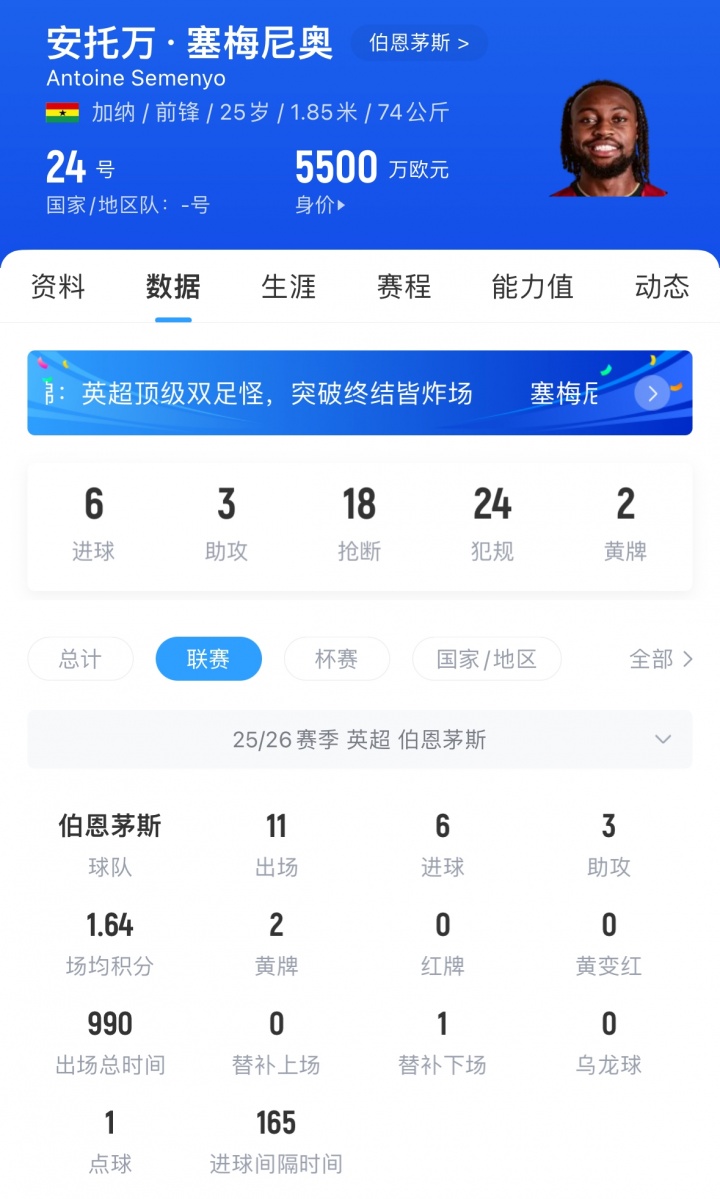 11月13日讯 据英媒Caughtoffside报谈,曼联特地在冬窗签下伯恩茅斯前卫塞梅尼奥。 音书称,曼联但愿速即动作,打败利物浦、阿森纳和曼城等队的竞争,在冬窗抢先签下塞梅尼奥。伯恩茅斯不肯出售这位中枢球员,要价可能会逾越6500万镑,致使接近8000万镑。 但是,曼联当今靠近利物浦的竞争,利物浦能为他提供一个重要变装的位置,因为球队需要一位不祥交班萨拉赫的球员。 塞梅尼奥现年25岁,司职前卫,他本赛季为伯恩茅斯出战11场英超,孝顺6球3助,他与伯恩茅斯的契约将在2030年到期,现身价5500万欧。
