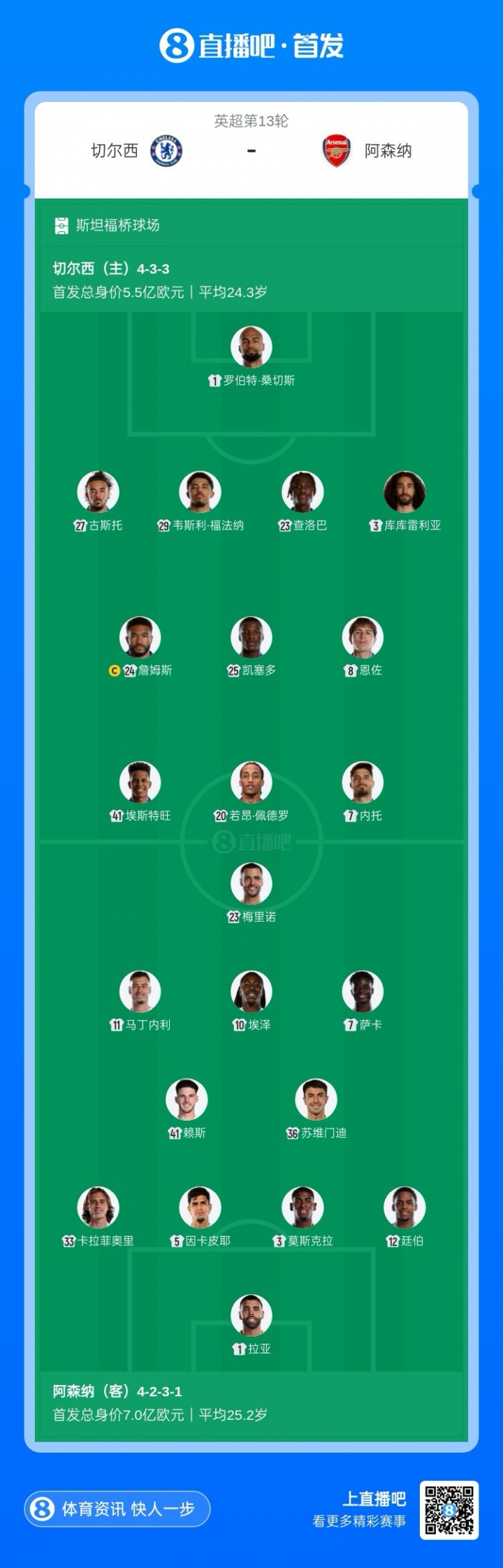 11月30日讯 英超第13轮,切尔西主场迎战阿森纳,赛前首发名单公布。【本场比赛两队中场凯塞多与赖斯正面交手,切尔西方面帕尔默复出镇守替补,阿森纳方面萨利巴考验中受伤,缺席本场比赛】 切尔西首发:1-桑切斯、27-古斯托、29-福法纳、23-查洛巴、3-库库雷利亚、24-詹姆斯、25-凯塞多、41-埃斯特旺、8-恩佐、7-内托、20-若昂·佩德罗 切尔西替补:12-约恩森、34-乔什·阿昌庞、4-阿达拉比奥尤、5-巴迪亚西勒、17-桑托斯、10-帕尔默、11-吉滕斯、49-加纳乔、9-德拉普 阿森纳首发:1-拉亚、12-廷伯、3-莫斯克拉、5-因卡皮耶、33-卡拉菲奥里、36-苏维门迪、41-赖斯、10-埃泽、7-萨卡、11-马丁内利、23-梅里诺 阿森纳替补:13-凯帕、49-斯凯利、4-本·怀特、8-厄德高、16-诺尔高、22-恩瓦内里、20-马杜埃凯、14-约克雷斯、9-热苏斯