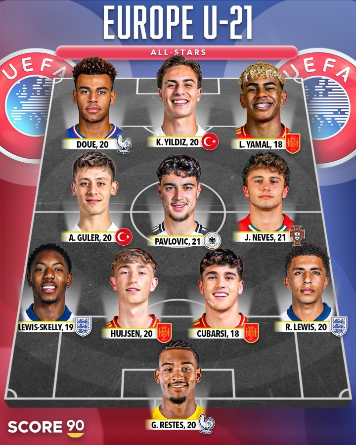 10月13日讯 Score 90评比了欧洲U21年事段的全明星声威,亚马尔、若昂-内维斯领衔,其中西班牙三东谈主,土耳其、法国、英格兰各两东谈主,葡萄牙、德国各一东谈主。 欧洲U21全明星声威: 时尚:杜埃(法国-巴黎)、伊尔迪兹(土耳其-尤文)、亚马尔(西班牙、巴萨) 中场:居莱尔(土耳其-皇马)、帕夫洛维奇(德国-拜仁)、若昂-内维斯(葡萄牙-巴黎) 后卫:斯凯利(英格兰-阿森纳)、赫伊森(西班牙-皇马)、库巴西(西班牙-巴萨)、里科-刘易斯(英格兰-曼城) 门将:雷斯特斯(法国-图卢兹) |