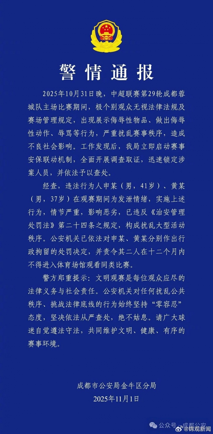 11月01日讯 成齐市公安局金牛分离局通报,2名球迷不雅战蓉城vs河南时,出现展示侮辱性物品、作念出侮辱性看成、口舌等行动,已被行政拘留。 【官方公告】 2025年10月31日晚,中超联赛第29轮成齐蓉城队主场比赛时辰,极个别不雅众无视法律规定及赛场措置司法,出现展示侮辱性物品、作念出侮辱性看成、口舌等行动,严重淆乱赛事规律,形成不良社会影响。职责发现后,我局立即运行赛事安保联动机制,全面开展探望取证,赶紧锁定涉案东谈主员,并照章给以查处。 经查,违规行动东谈主申某(男,41岁)、黄某(男,37岁)在不雅赛时辰为发泄厚谊,实行上述行动,情节严重,影响恶劣,已违抗《步骤厝置处罚法》第二十四条之司法,组成淆乱大型行动规律。公安机关已照章对申某、黄某分别作出行政拘留的处罚决定,并责令其二东谈主在十二个月内不得参预开通场馆不雅看同类比赛。 |