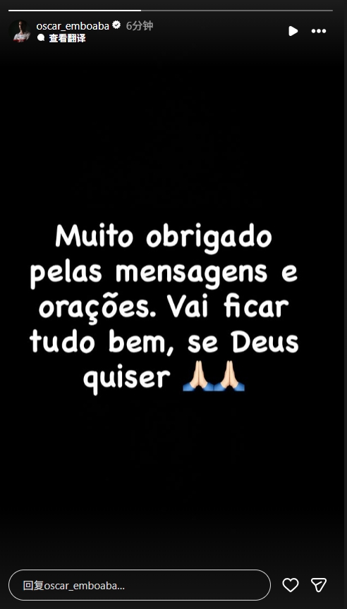 11月12日讯 在当天腹黑出现特殊送医后,奥斯卡首度更新社媒:绝顶感谢您的留言与祷告。若天主喜悦,一切自会好转🙏🙏