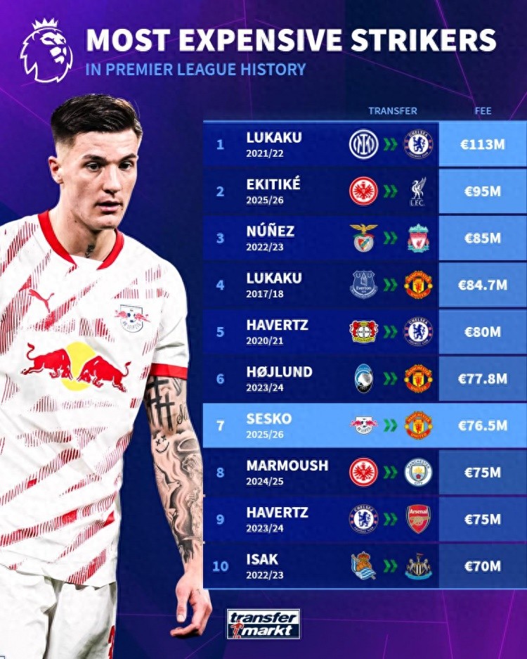 至于公认的英超第一中锋哈兰德,当初曼城引进他时,只破耗了6000万欧元,因此无缘上榜。 |