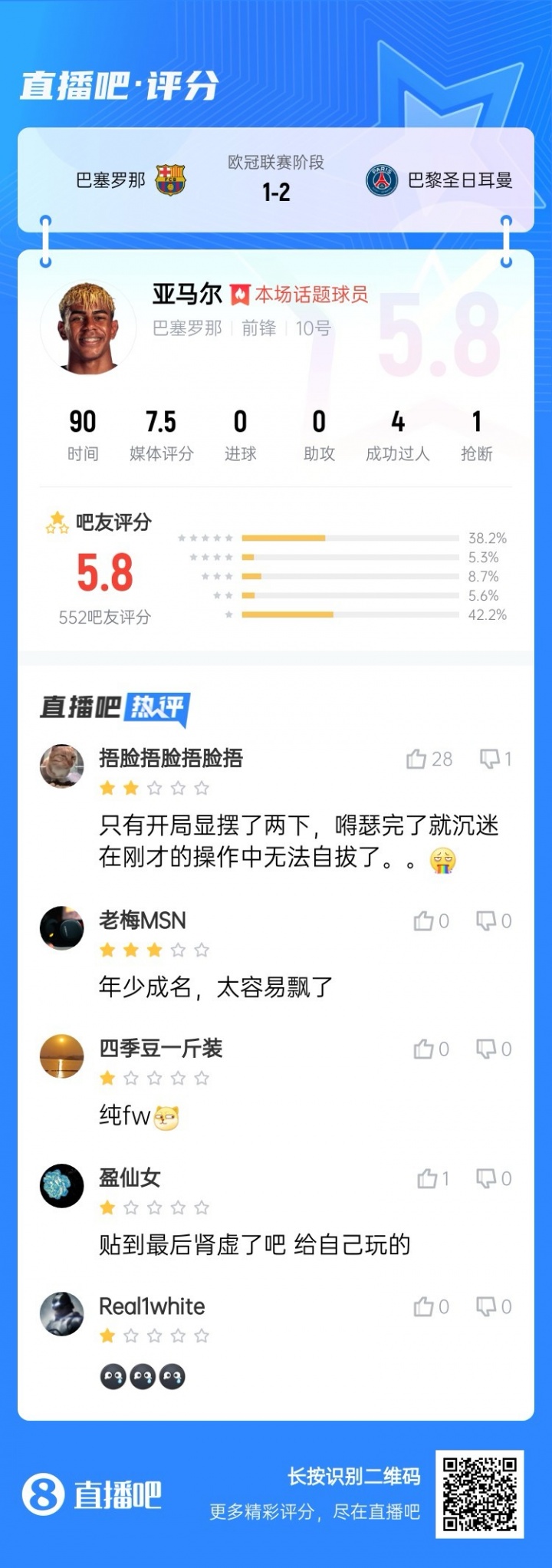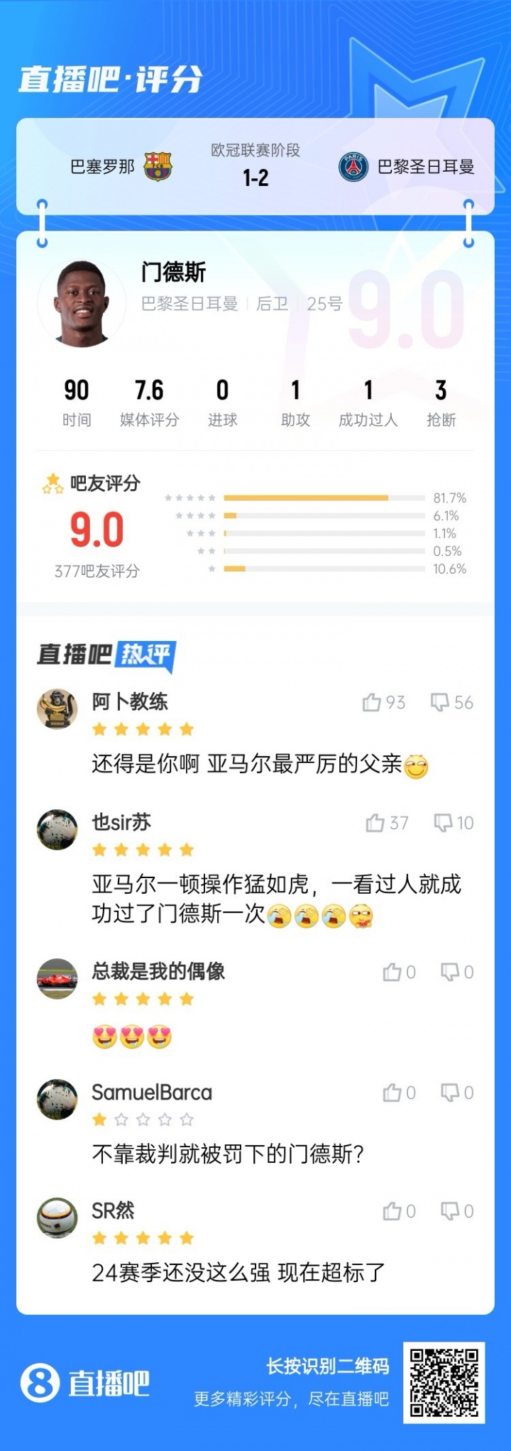 10月02日讯 欧冠联赛阶段第2轮巴萨1-2巴黎,赛前阿什拉夫在新闻发布会上曾暗示:“亚马尔濒临的是宇宙最好左后卫努诺-门德斯。门德斯有能力像戒指其他访佛膺惩手那样防住亚马尔。” 吧友们合计门德斯本场是否戒指了亚马尔的进展? |