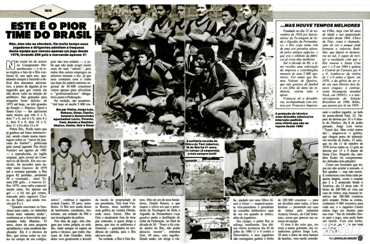 宜必想队的故事充满了辱没:长达4年的不胜,10球以上的惨败、足球被踢扁、球员被山羊追逐……几十年来,他们波折于各个城镇,寻找始终的家园。他们最著名的球员——混名“毛罗·香波”的剪发师——只为他们进过一球。 最引东说念主注策画是,宜必想队曾近四年未始胜绩。如斯厄运的战绩让他们别无采用,只可千里浸在悲悼之中,并将其融入球队的品牌形象之中。他们的安谧物名叫“Derrotinha”(小失败)。俱乐部的酬酢媒体账号时常说起他们与失败的亲密干系,球员红黑球衣领口上缝着的一个小LOGO也不忘请示群众。 LOGO上头的字是:“世界最差球队”。 1 宜必想俱乐部由一家纺织厂的工东说念主于1938年创立,并以公司符号——原产于南好意思洲的赤鹮(宜必想便是鹮的趣味)——定名。直到1958年工场易主之前,它一直是一支工东说念主军队。 那时,宜必想队照旧贯穿九年参加州锦标赛,并取得了令东说念主瞩策画到手,他们打败过累西腓最大的两支球队——诺蒂科队和累西腓体育队。很快,宜必想队也取得了巴西寰球的认同:因为匡助巴西队夺得1958年和1962年世界杯冠军的瓦瓦,其行状糊口就始于宜必想后生队。宜必想后生队还培养出了另一位巴西国脚里尔多,他在1963年至1969年间代表巴西队出场38次。 通盘这些都标明,宜必想并非从建筑来源便是个烂队,关联词,它们确乎遭受了侥幸的讥嘲。 20世纪70年代末,球队收成一齐下滑。1978年,宜必想队0∶10负于诺蒂科队、0∶13负于圣克鲁斯队。1979年,他们参加了12场州冠军赛,全部落败。你认为这便是球队的最低谷了?你照旧太乐不雅了。 从1980年7月20日至1984年6月17日,宜必想队在55场比赛中一场未赢,他们输掉了其中的48场。这段时刻他们的净胜球数为-206个。宜必想队称这是足球史上最长的不胜记录。 需要诠释的是,这方面并莫得明确的官方记录。咫尺尚不深切宜必想队所宣称的记录是贯穿不胜的比赛场次,照旧贯穿不胜的时刻(1428天——骨子上,他们在2008年6月5日至2012年8月1日历间又一次贯穿不胜,从时刻上来算照旧任性了这一记录)。他们宣称我方的名字出当今吉尼斯世界记录大全中,但吉尼斯世界记录的一位发言东说念主说,他们的档案中并莫得这样的记录。