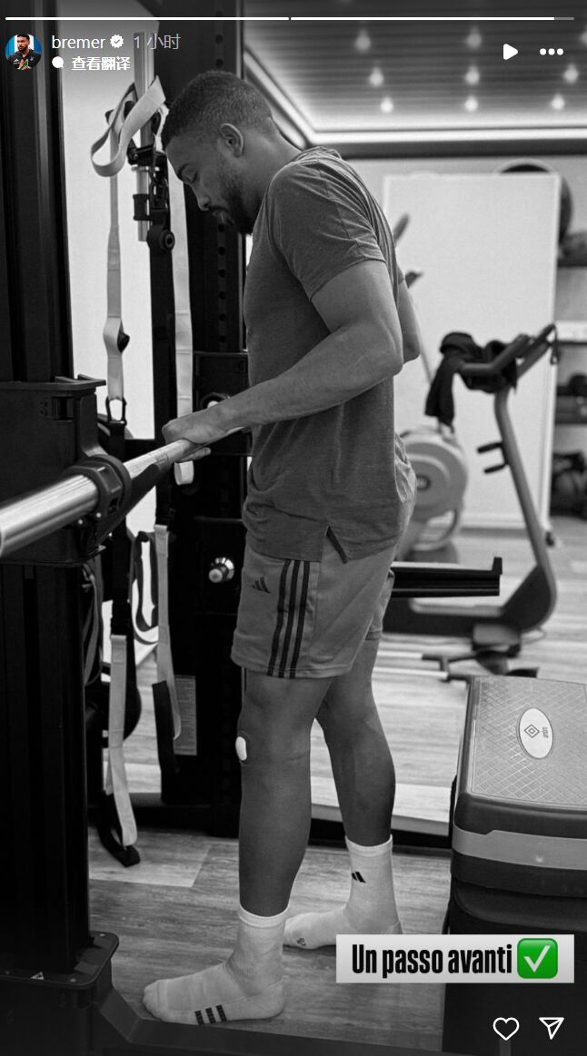 10月18日讯 尤文后卫布雷默此前已得胜摄取左膝半月板手术,展望将缺阵约六周期间。 布雷默社媒晒图:身处健身房,正在进行复原性历练。像片的右下角配成心大利语笔墨“Un passo avanti”,意为“上前一步”。 |