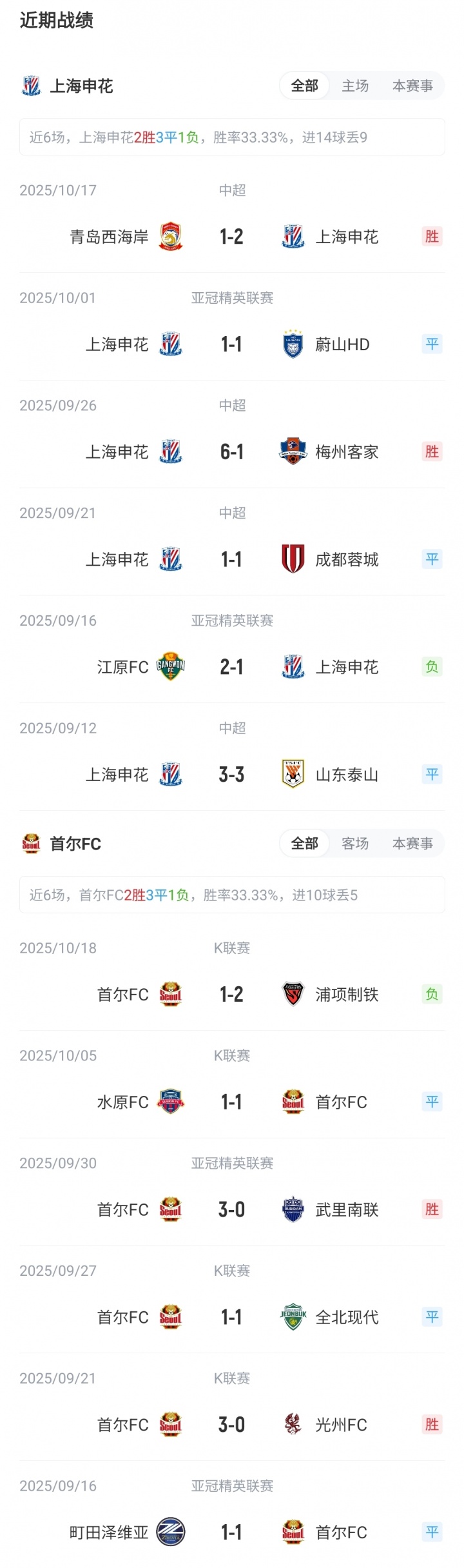 【近期战绩及交锋历史】 当今亚冠精英联赛东亚区积分榜上,申花1平1负积1分,位列第11;首尔1胜1平积4分,位列第4。两边此前从未有过交手。