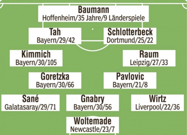 11月17日讯 北京技能来日凌晨,德国将在欧洲世初赛终末一轮比赛中主场对阵斯洛伐克,《图片报》展望了德国队本场比赛的首发声势。 图片报展望德国队首发 门将:鲍曼(霍芬海姆) 后卫:基米希(拜仁)、若纳坦·塔(拜仁)、施洛特贝克(多特)、劳姆(莱比锡) 中场:格雷茨卡(拜仁)、帕夫洛维奇(拜仁)、萨内(加拉塔萨雷)、格纳布里(拜仁)、维尔茨(利物浦) 先锋:沃尔特马德(纽卡) |
