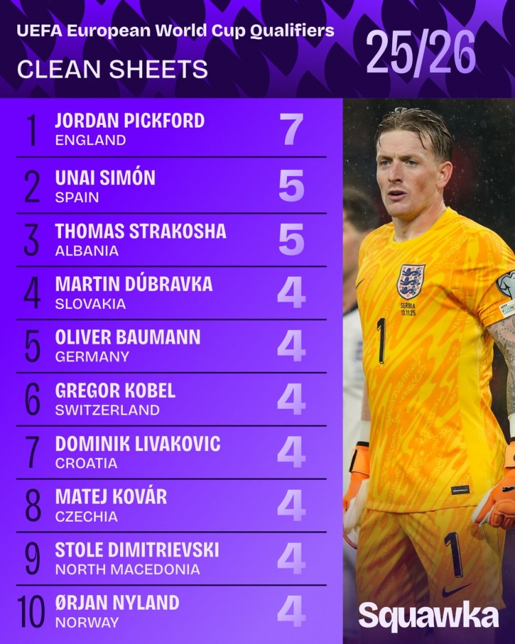 11月20日讯 Squawka统计世欧预各队门将零封场次,皮克福德7场居首,乌奈·西蒙、斯特拉科沙5场第二。 世欧预门将零封榜: 1、皮克福德(英格兰):7场 2、乌奈·西蒙(西班牙):5场 斯特拉科沙(阿尔巴尼亚):5场 4、杜布拉夫卡(斯洛伐克):4场 鲍曼(德国):4场 科贝尔(瑞士):4场 利瓦科维奇(克罗地亚):4场 科瓦尔(捷克):4场 迪米特雷夫斯基(北马其顿):4场 尼兰德(挪威):4场 |