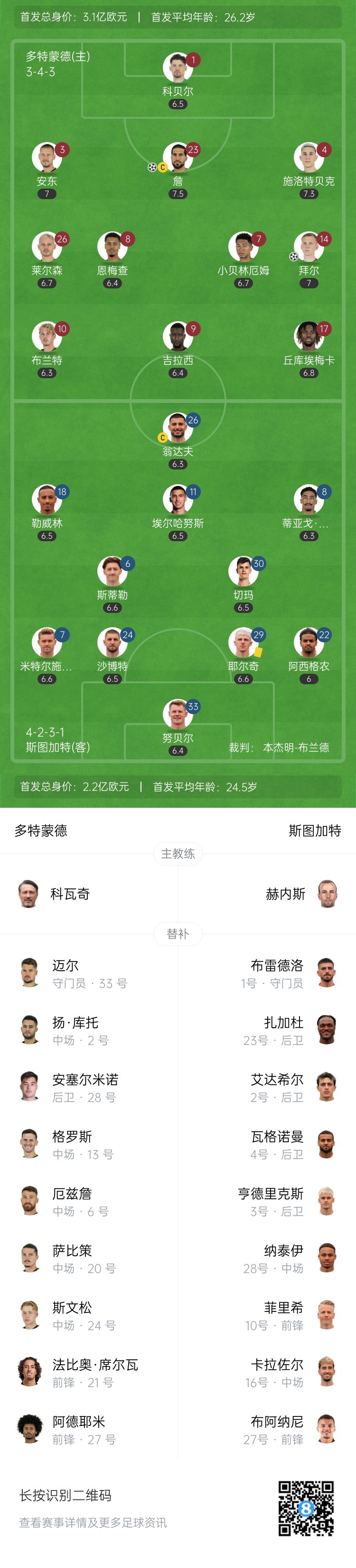 【比赛要津事件】 第32分钟,多特获取点球,埃姆雷·詹主罚稳稳掷中!1-0!多特首开纪录!↓ 第41分钟,吉拉西爆射被扑,拜尔两连击,努贝尔不息神扑但难阻皮球上钩!2-0!多特半场适度前再下一城!↓ 【比赛焦点蓦然】 第14分钟,吉拉西头球攻门顶高了。↓ 第19分钟,蒂亚戈·托马斯的撞射略微偏出。↓ 伤停补时3分钟。上半场比赛适度,多特2-0斯图加特。 【两边首发以及替补信息】