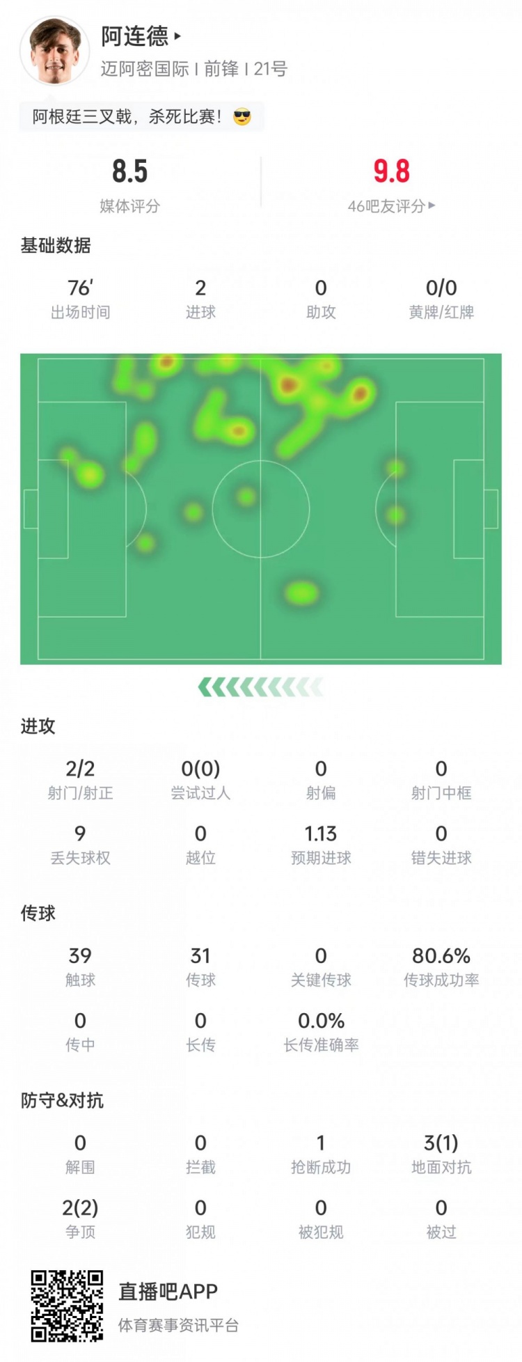 11月24日讯 好意思职联东区半决赛,阿连德梅开二度,匡助迈阿密外洋4-0打败辛辛那提FC,晋级下一轮。 阿连德本场比赛数据: 出场时辰——76分钟 进球——2 射门——2(射正2) 丢失球权——9 预期进球——1.13 触球——39 传球——31 传球得胜率——80.6% 抢断得胜——1 大地抗拒——3(得胜1) 争顶——2(得胜2) 媒体评分——8.5 |