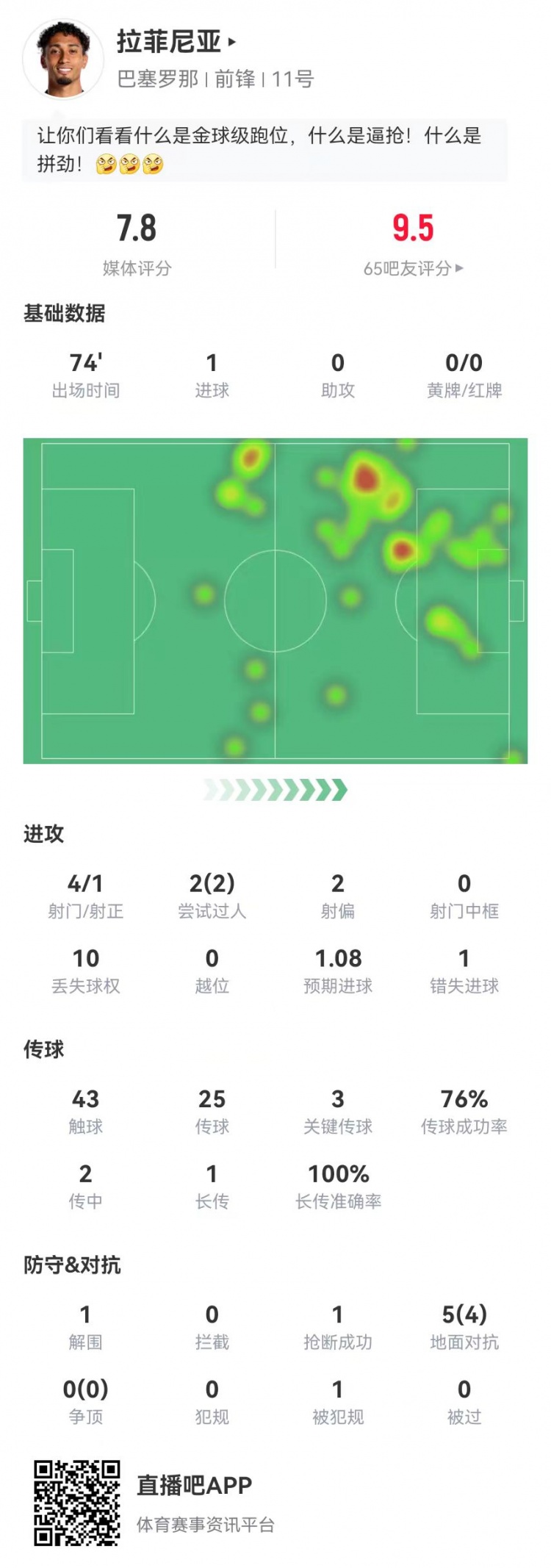 12月3日讯 巴萨在本轮西甲对阵马竞,拉菲尼亚本场数据如下: 首发出战74分钟 1球 4射1正 2过东说念主、2到手 1错失进球 预期进球1.08 10丢失球权 43触球 25传球,到手率76% 3要道传球 2传中 1长传 1突围 1抢断 5抵拒、4到手 1造犯规 获评7.8分 |