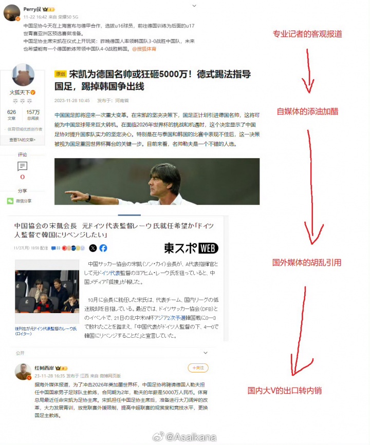 据多家韩媒报谈,前韩国主帅克林斯曼可能被任命为中国男足主帅。不外据查证,韩媒征引的讯息出自中国国内自媒体,不具备真确度。 媒体东谈主热议 王晓瑞:韩国媒体的爆料基本齐是征引“中国自媒体”。某家数自媒体天天编作秀新闻,重要是国内圈里东谈主齐知谈这不靠谱,韩国记者们齐信以为真,然后征引中国自媒体在那加工版胡编滥造,然后中国球迷看到韩国媒体撰文,又以为是韩国媒体爆料,殊不得而知谣传讹。重要是这种事根柢莫得东谈垄断,前几天韩国媒体还在那YY某中国国脚打假球,效果仔细一看依然征引中国自媒体的胡编。对此景况,只可四字追忆:“太丢东谈主了”,何况十分影响国外形象,重要还齐是谰言风语的事情,的确得需要有东谈垄断一管。 裴力:克林斯曼要来了,中国足球更干扰了。东谈主脑袋能打成狗脑袋。有莫得水平另说,克林斯曼这性格,可不是个好伺候的主。 李璇:我认为一万个弗成能,这种素养,本人实力一般,然则本性贼大。韩国东谈主我方体验过,吃过大亏,当今还但愿中国足协也掉坑里,安的什么心? 中国足协前次选伊万,本领紧,任务重。此次本领充分,细则不会让我方再掉坑里。 朱艺:又到了发这张图的时候了,哈哈