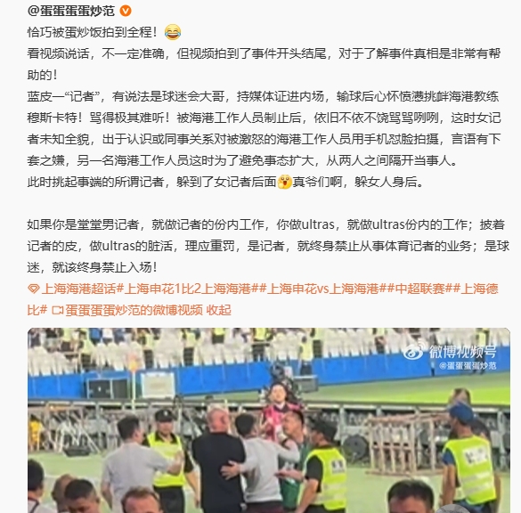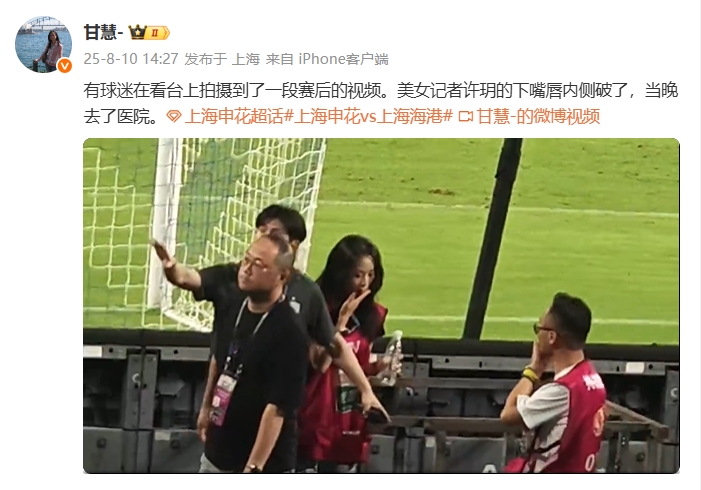 昨晚进行的中超第20轮焦点战,上海申花1-2上海海港,赛后一段视频在网文雅传,包括穆斯卡特翻译在内的海港责任主谈主员与申花记者许玥发生争捏。 事件缘故是因为海港东谈主员赛后谢场时平直踩踏带有申花标志的地毯。当天据申花跟队甘慧清晰,记者许玥下嘴唇内侧破了,当晚去了病院。