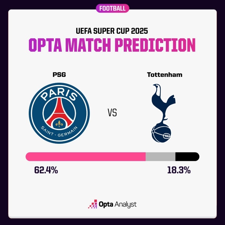 08月13日讯 明晨3:00,欧洲超等杯,巴黎圣日耳曼vs热刺。赛前,数据网站opta展望了欧超杯的胜者。 巴黎圣日耳曼是今晚夺冠的热点球队,惯例时辰内得胜的概率为62.4%。 热刺在10000次模拟中得胜的概率是18.3%,两边干与点球大战的概率是19.3%。