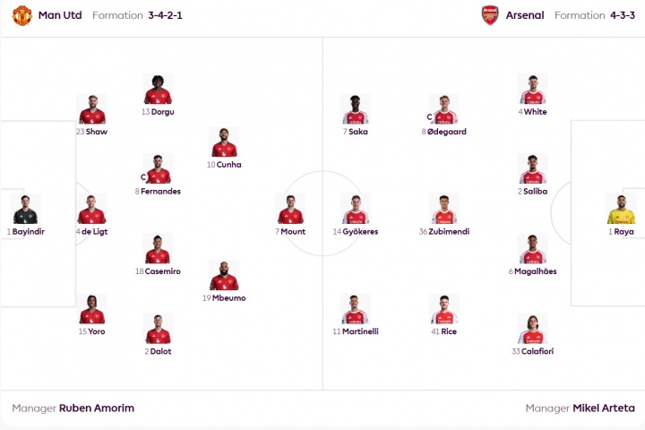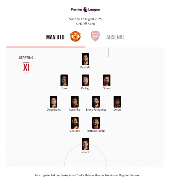 1-巴因德尔 15-约罗、4-德里赫特、23-卢克-肖 2-达洛特、18-卡塞米罗、8-B费、13-多古 19-姆贝莫、10-库尼亚 7-芒特 曼联vs阿森纳首发:姆贝莫、库尼亚、约克雷斯出战,塞斯科替补