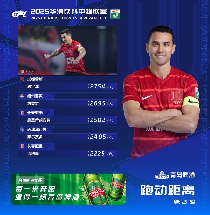 8月17日讯 字据中超官方统计,周定洋再度登顶中超单轮跑动榜。 中超第21轮成齐蓉城对阵青岛海牛,蓉城中场周定洋跑动距离达到12754米,时隔三轮之后再度登顶跑动距离榜,此前不时三轮领跑该榜单的梅州客家球员约契奇本轮名纪律二位。 附中超第21轮跑动榜: 1、周定洋(成齐蓉城)12754米 2、约契奇(梅州客家)12695米 3、奥莫伊胡安弗(长春亚泰)12502米 4、萨尔瓦多(天津津门虎)12405米 5、徐浩峰(长春亚泰)12225米 |