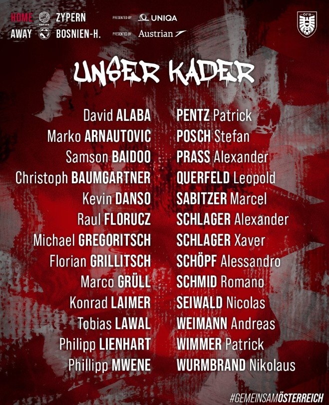 8月26日讯 为了迎接行将到来的对阵塞浦路斯和波黑的世初赛,奥地利国度队公布了新一期的大名单,阿拉巴领衔,萨比策、莱默尔、阿瑙托维奇入选。 以下为具体名单: 门将:拉瓦尔(亨克)、彭茨(布隆德比)、亚历山大-施拉格尔(萨尔茨堡) 后卫:阿拉巴(皇马)、拜多(朗斯)、丹索(热刺)、林哈特(弗赖堡)、姆韦内(好意思因茨)、波施(博洛尼亚)、普拉斯(霍芬海姆)、科尔菲尔德(柏林有计划) 中场:鲍姆加特纳(莱比锡)、格里利奇(霍芬海姆)、格鲁尔(不莱梅)、莱默尔(拜仁)、萨比策(多特)、施拉格尔(莱比锡)、施密德(不莱梅)、舍普夫(沃尔夫斯贝格)、塞瓦尔德(莱比锡)、维默尔(沃尔夫斯堡) 先锋:阿瑙托维奇(贝尔格莱德红星)、弗洛鲁兹(圣吉罗斯)、格雷戈里奇(布隆德比)、魏曼(德比郡)、沃姆布兰德(维也纳快速) |