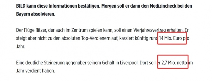 07月30日讯 本日拜仁官宣签下利物浦时尚迪亚斯,据《图片报》报说念,迪亚斯的转会费+奖金总和7500万欧元。 报说念称,迪亚斯在拜仁的年薪预测为税前1400万欧元,相较其在利物浦时分的净年薪(约270万欧)收场显赫增长。