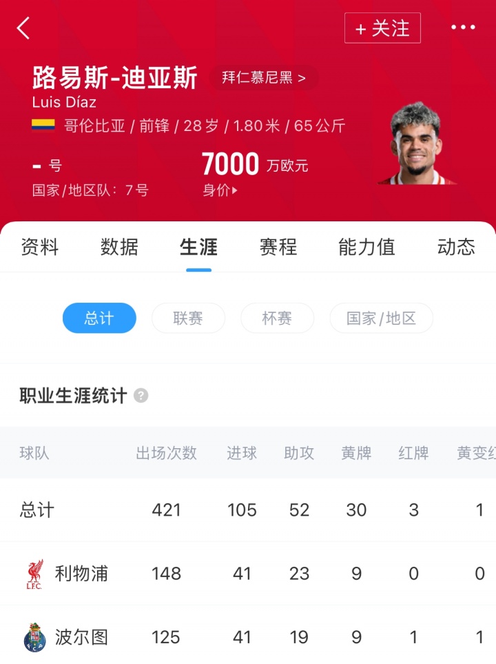 迪亚斯自2022年1月加盟利物浦以来,共出场148次,孝顺41球23助,现在其德回身价为7000万欧。