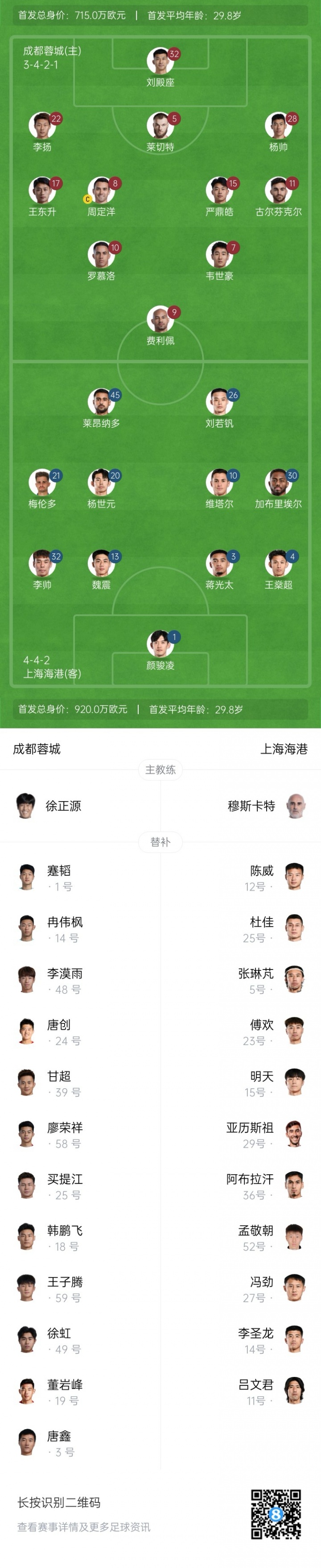 本场比赛是现在中超三四名之间的较量,赛前蓉城22轮47分位居第四,海港1分上风位列第三且与第二名国安同分,过期申花1分。 蓉城中超近5轮取4胜,海港则已13轮不败,本赛季首回合交手,蓉城客场3-1打败海港。