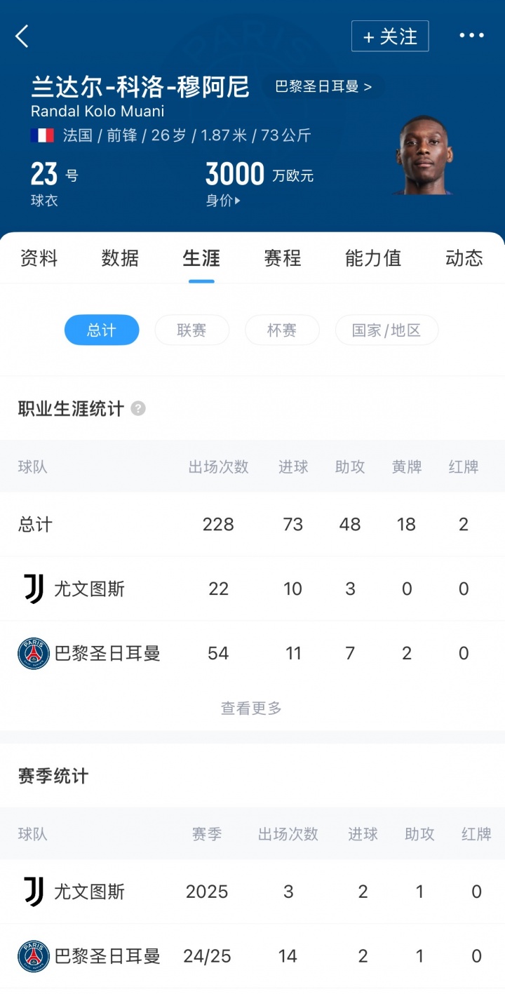 穆阿尼现年26岁,法国先锋。穆阿尼2023年夏窗9500万欧元从法兰克福加盟巴黎,上赛季被巴黎租出至尤文图斯。效用尤文时分球员出场22次,孝敬10球3助。现在穆阿尼德回身价为3000万欧元。