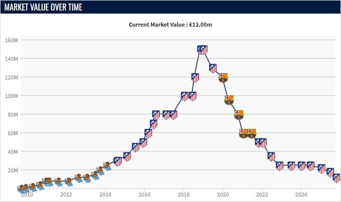 10月03日讯 德转昨日更新了西甲联赛的球员身价,34岁的格列兹曼身价赓续下落,还剩1200万欧。 1991年生的格列兹曼当今仍是34岁,身价下落是未免的。本赛...