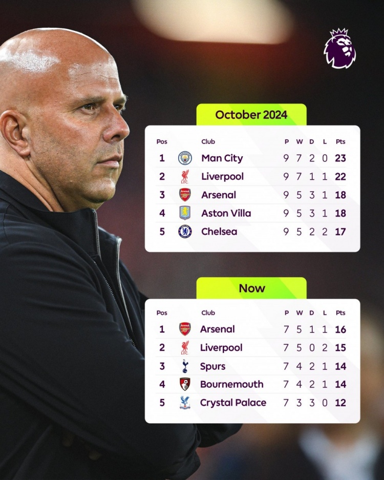 10月5日讯 英超第7轮比赛,利物浦客场1-2不敌切尔西。 此役事后,利物浦5胜2负积15分,英超名瓜代二位,阿森纳积16分登上榜首位置。 据英超官方统计,2024年10月之后,利物浦初次在比赛周贬抑时未能处于英超榜首位置。 |