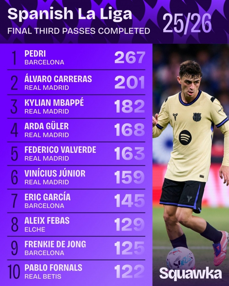 10月7日讯 日前,Squawka统计了本赛季西甲弥留三区传球次数名次,佩德里267次居首,5名皇马球员进前十。 1、佩德里(巴萨):267次 2、卡雷拉斯(皇...