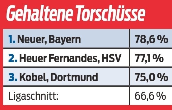 10月8日讯 《体育图片报》统计了本赛季门将在德甲联赛中的扑救告捷率,比肩出前三名榜单,拜仁39岁门将诺伊尔以78.6%居首。 本赛季德甲扑救告捷率排行: 诺伊尔(拜仁)——78.6% 霍伊尔-费尔南德斯(汉堡)——77.1% 科贝尔(多特)——75% 德甲门将平均——66.6% |