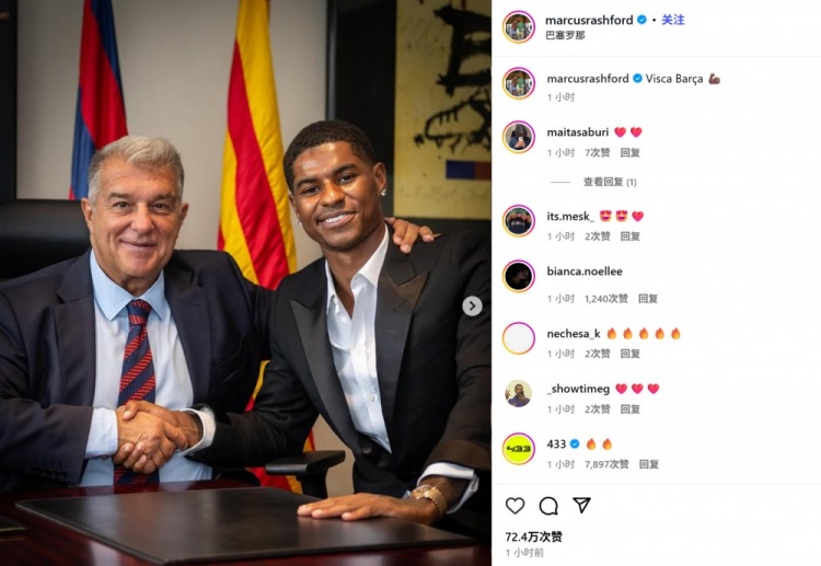 7月24日讯 巴萨一经官宣引进曼联时尚拉什福德,后者也社媒晒照挂念。 拉什福德先是晒出了我方和拉尔波塔的签约照,并配文:“巴萨万岁!”
