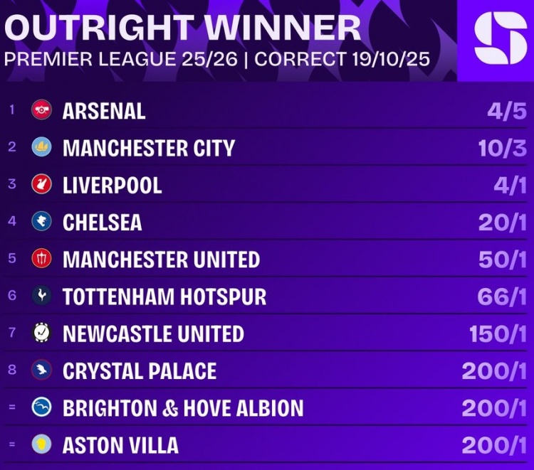 10月20日讯 利物浦不敌曼联,遭逢联赛三连败。英超夺冠赔率方面,阿森纳以5赔4的赔率成为最大的夺冠热点。曼城以3赔10的赔率位居第二,利物浦则以1赔4的赔率排行第三。 英超联赛25/26赛季冠军赔率 阿森纳:5赔4 曼城:3赔10 利物浦:1赔4 切尔西:1赔20 曼联:1赔50 热刺:1赔66 纽卡斯尔联:1赔150 水晶宫、布莱顿、维拉:1赔200 |