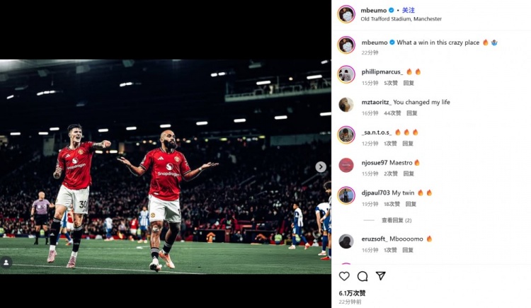 10月26日讯 曼联在本轮英超焦点战4-2力克布莱顿,姆伯莫梅开二度。 第61分钟,曼联中场得球测度打算伏击,舍什科送出直塞,姆伯莫带球突入禁区低射到手。 第90+6分钟,海文中圈上前送出直塞,姆伯没有球突入禁区,随后起脚爆射,这球击中横梁下沿弹进球门。 他也在赛后通过社媒晒出我方的“嚣张”摊手庆祝照,并配文:“在这放浪之地的精彩生效🔥🤷🏽♂️” |