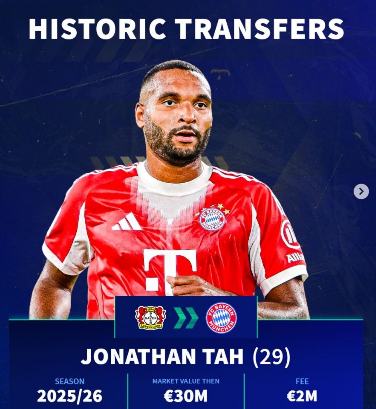 11月1日讯 拜仁将在本轮德甲焦点战对阵勒沃库森,若纳坦-塔对阵旧主,《转会市集》也列出了新世纪两队之间的转会: 若纳坦-塔(29岁),25-26赛季,转会费200万,身价3000万