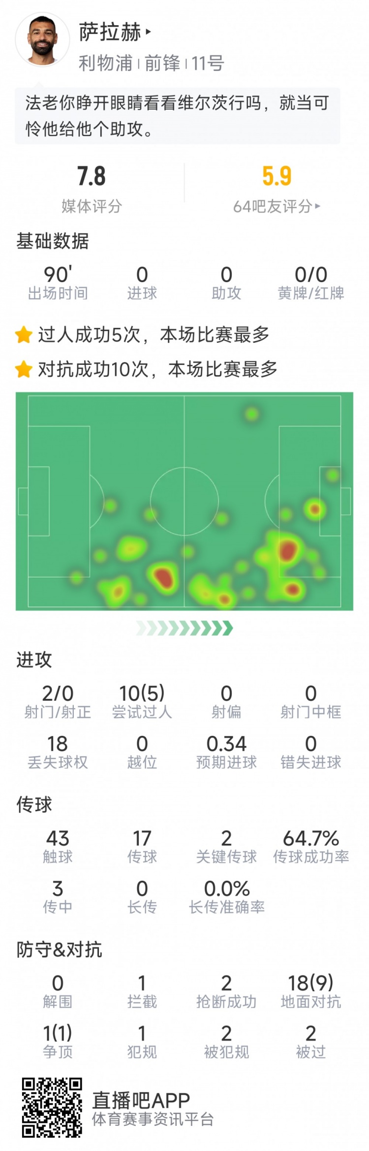 11月5日讯 在本轮欧冠,利物浦1-0皇马,以下为萨拉赫本场数据: 比赛技巧90分钟 2次射门0射正 10次过东说念主5次告捷 43次触球 2次关节传球 传球告捷率65% 1次约束 2次抢断 19次扞拒10次告捷 评分7.8分 |